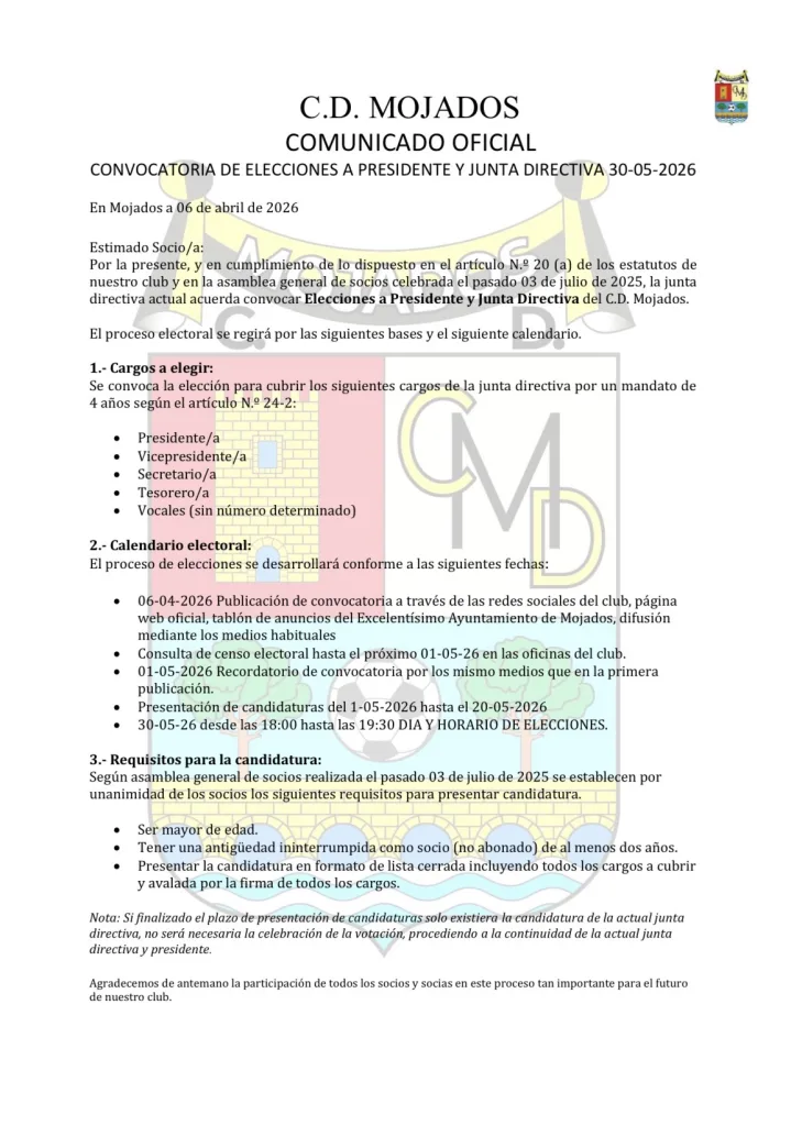 Convocatoria de elecciones a presidente y junta directiva 30-05-2026.